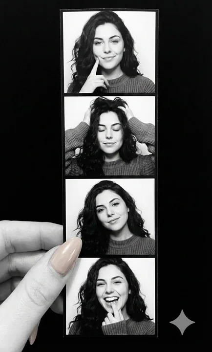 高解像度で写真にリアルなクローズアップ。白い肌の手が、長く裸色のネイルをした指で、垂直に並んだ4つの黒白のフォトブースの写真ストリップを握っている様子。背景は純黒。手は鮮やかな色彩で、明るく自然な照明が当たっており、モノクロの写真ストリップの柔らかいスタジオ照明と対照的。ストリップには、黒い巻き髪の若い女性が4つのポーズを取っている。頬をつついてみたり、目を閉じて髪をかきあげたり、頭を傾けながら優しく笑ったり、唇を触りながら笑顔を浮かべたり。前景には、長く杏仁形の裸色のネイルをした手がストリップの左下を握っている。全体の雰囲気は率直で懐かしく、光沢のある写真紙、髪の質感、そして滑らかなネイルのすべてに非常に詳細な質感が表現されている。