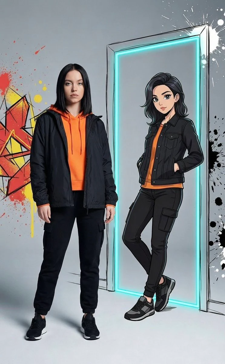 "lighting": "Soft, diffused studio lighting on the real model; flat illustrative lighting on the anime character",