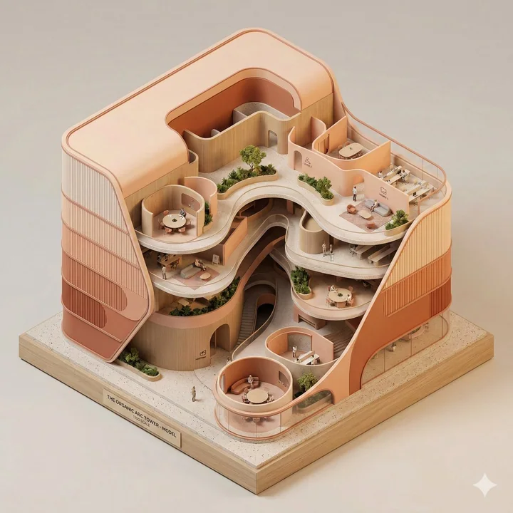 A conceptual architectural isometric model of an organic-form corporate office tower, presented as an exhibition-scale diorama. The building is shown with a cutaway section, exposing fluid spatial flow, curved meeting rooms, and lounge zoning from a top-down isometric perspective. Volumes are lightly separated by seamlessly curved translucent partitions to suggest circulation and function. Warm micro-LEDs illuminate the individual floors from within. Strong use of negative space and clear compositional hierarchy. Thin structural outlines, soft pastel lavender and mint, ribbed wood and dark terrazzo tones, minimal abstract signage, subtle human-scale markers. Smooth surfaces, pill-shaped rounded edges, dramatic controlled studio lighting, architectural model photography style, clean dark neutral background, high-detail yet minimal.