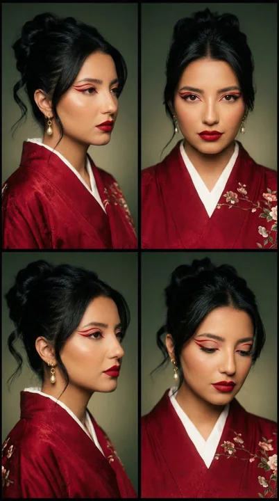 "scene_summary": "Люксовые кинематографические портреты, вдохновленные традиционной восточноазиатской элегантностью, объединенными с современным графическим макияжем. Та же женщина во всех четырех панелях.",