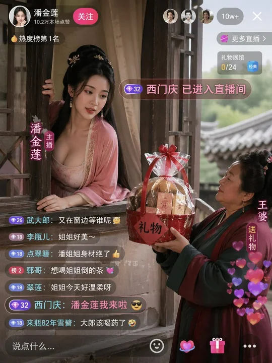 Pan Jinlian propping open the window on the balcony, bullet comments scrolling "Ximen Qing has entered the live stream", Wang Po sending a gift.