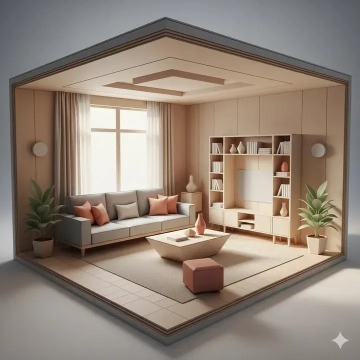 Яркий, крупномасштабный разрез комнаты в стиле оригами, занимающий большую часть кадра. Вся пространство выполнено из свернутых бумажных плоскостей: диван, журнальный столик, пол, стены, окно, полки и декор — всё сформировано чёткими, архитектурными складками. Пастельная цветовая гамма (тёплые бежевые стены, приглушённый серый диван, мягкие акценты терракотового цвета, светлые оттенки дерева). Текстура бумаги прослеживается везде. Естественное дневное освещение, мягкие тени между складками, чистая геометрия, ощущение премиум-современного интерьера.