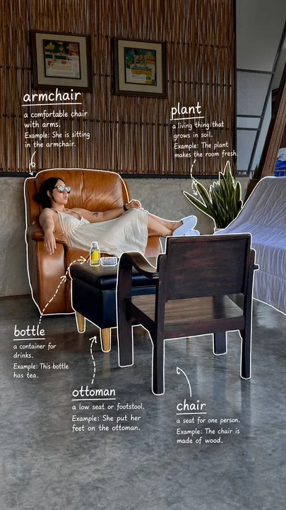 [Task Objective] Identify 5 objects in the photo, and for each object add: 1. English word 2. Simple English definition 3. Optional short example sentence [Number of Annotations] * Only mark 5 objects * Do not exceed 5 * Prioritize common, easy-to-learn objects from daily life * If there are many objects in the picture, only pick the 5 most typical ones [Drawing Style Requirements] * Use white thin line hand-drawn style for annotations * Lines should look casually drawn, with a single-stroke feel * Lightly trace a circle of outline along the edge of the object * Can add a small number of arrows and dashed lines to assist in pointing * Do not make it too neat, maintain a natural and relaxed feel * Do not fill the picture, keep white space [Text Format] Write next to each object: * English word * A simple English explanation * An optional short example sentence Reference format: coffee a drink you can have in the morning Example: I drink coffee every day. bread soft food made from flour Example: I had bread for breakfast. [Text Style] * Mainly in English * Explanations should be simple, suitable for beginners * Do not write like a dictionary * More like small notes for learning words from pictures * Words should be more prominent, explanations and example sentences slightly smaller [Overall Vibe] * Like handwritten English learning annotations on daily photos * Clean, natural, with white space * Like light learning content on social media * Not too complex, not too full, not too decorative [Output Focus] The focus is: Only select 5 objects → label English words → pair with simple usage explanations → make the whole picture look relaxed and natural. Make the aspect ratio 9:16