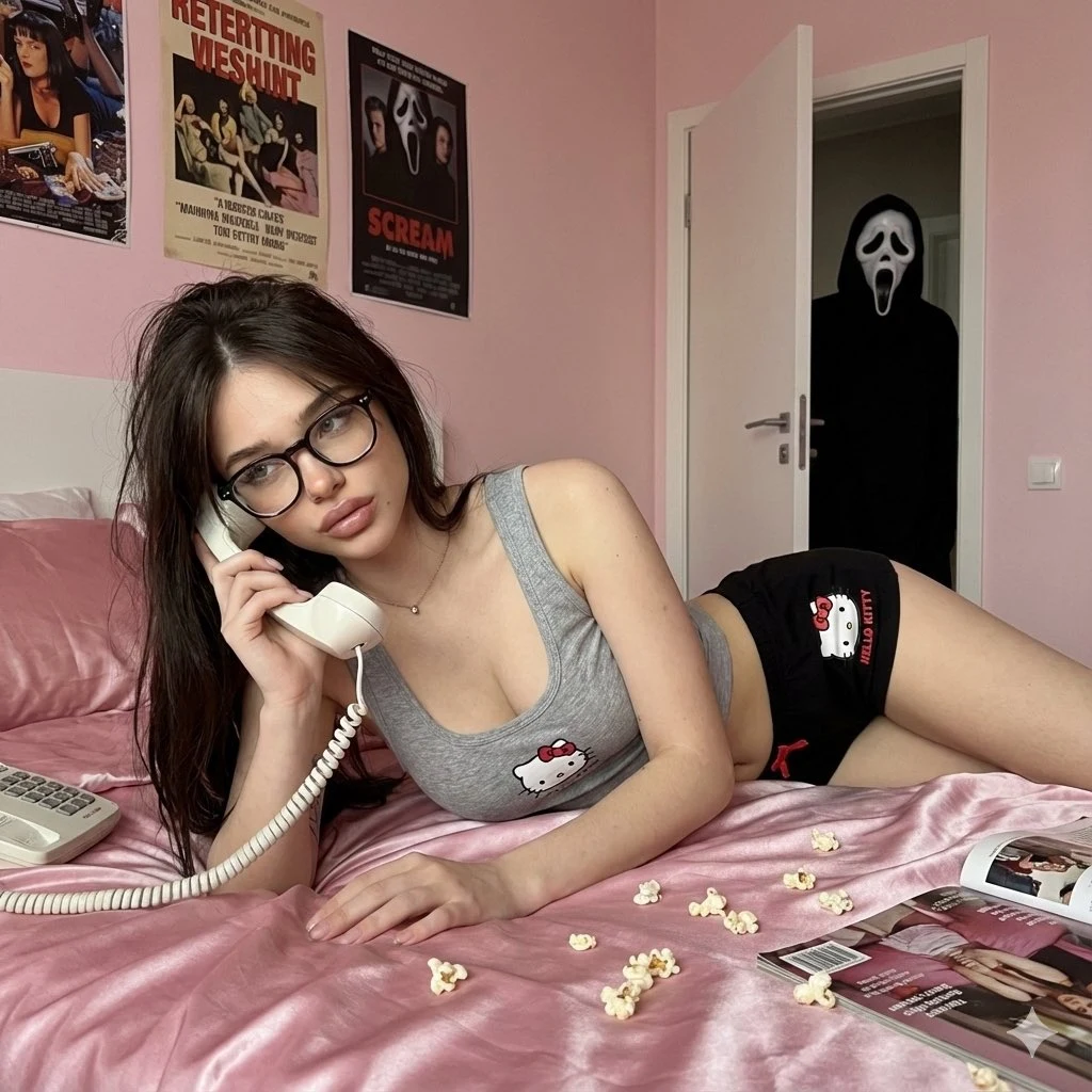 { "meta": { "width": 1200, "height": 1200, "aspect_ratio": "1:1", "version": "1.0" }, "scene_composition": { "subject": { "demographics": "Young woman, unspecified ethnicity", "physical_attributes": { "hair": "Long black hair, natural texture, slight messy volume", "skin": "Natural realistic texture, visible pores and minor imperfections, non-airbrushed", "makeup": { "style": "Soft glam, pink tones", "details": [ "smooth blush", "soft eyeliner", "defined lashes", "natural glossy lips" ] } }, "pose": { "body": "Lying on stomach on bed, upper body propped on forearms", "head": "Tilted slightly to the side", "expression": "Soft, calm, relaxed gaze", "action": "Holding vintage handset phone to ear" } }, "wardrobe": { "aesthetic": "Cute homewear / pajama style", "items": { "top": "Grey Hello Kitty tank top, small frill trim, bow detail", "bottom": "Black Hello Kitty shorts, pink drawstring, printed graphic" } }, "environment": { "foreground": { "location": "Bed", "textiles": "Soft pink satin sheets and pillows, slightly wrinkled", "scatter_items": [ "Vintage magazines", "Popcorn pieces" ], "props": "Vintage-style white handheld telephone with coiled cord" }, "background": { "walls": "Soft light pink", "decor": "Retro posters", "architectural": "White door, partially open", "narrative_element": "Dark figure wearing a Scream mask standing in the open doorway", "ambience": "Darker hallway behind the door creating contrast" } } }, "technical_specifications": { "camera_gear": "iPhone 16 Pro Max emulation", "lens_perspective": "Front-facing or close-range low angle", "lighting": { "type": "Natural indoor ambient", "quality": "Soft, even illumination on subject", "shadows": "Natural, no harsh flash" }, "visual_style": { "quality": "Slightly soft realism, not HD, phone photography aesthetic", "processing": "Unedited look, raw feel, natural color profile", "filters": "None" } }, "generated_prompt_string": "A realistic phone photo of a young woman lying on her stomach on a bed with pink satin sheets, wearing a grey Hello Kitty tank top and black shorts. She is holding a white vintage telephone to her ear. Messy long black hair, soft pink makeup, natural skin texture. The bed is scattered with magazines and popcorn. In the background, an open door reveals a dark figure wearing a Scream mask standing in the shadows. Shot on iPhone 16 Pro Max, flash off, soft natural lighting, low angle, unedited aesthetic." }