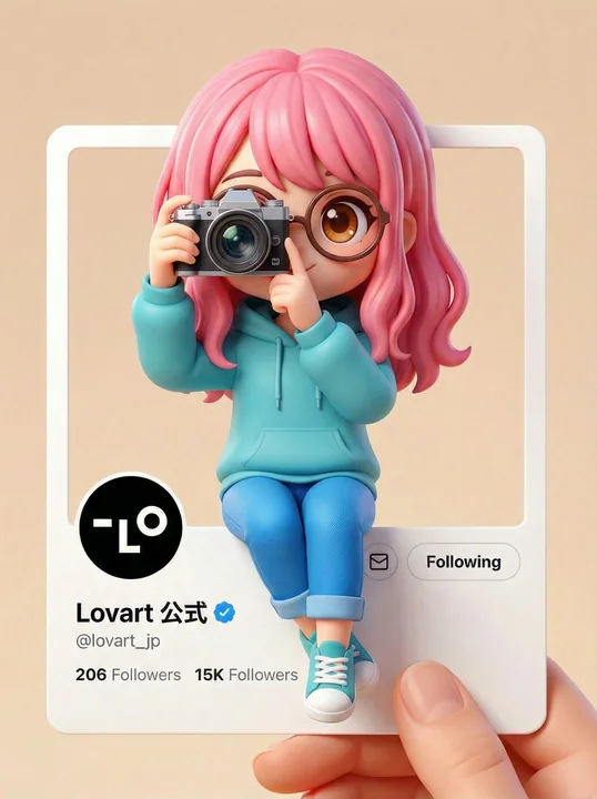 Милый, сверхдетализированный 3D-анимационный стиль, в стиле Pixar/Disney, естественно сидит на нижнем краю карточки профиля X (Twitter), медленно поднимаясь из рамки профиля. Особенности лица персонажа основаны на: "Input Image". Девушка сидит на рамке профиля. Девушка фотографирует с помощью камеры. На интерфейсе профиля X отчетливо отображаются следующие элементы: Имя: Lovart Official (синий значок проверки), Имя пользователя: @lovart_jp. Чистый, современный интерфейс X (Twitter), белая карточка профиля с закругленными краями, ненавязчивые иконки "Input Image", видимое изображение профиля. Рука человека, удерживающая нижний край социальной карточки. Мягкий пастельный бежевый фон, теплый свет студии, реалистичные глубина и тени, кинематографическая композиция, сверхвысокое разрешение, 4K, профессиональная 3D-иллюстрация, эстетика социальных сетей.