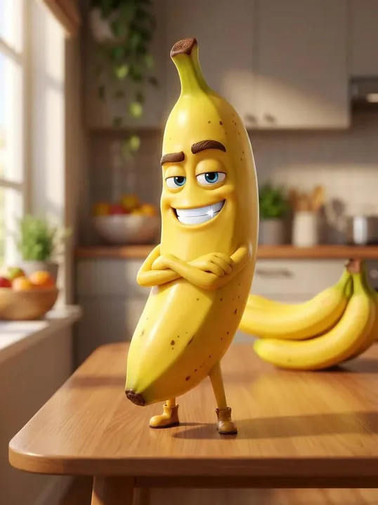 3D-анимационный персонаж в стиле Pixar, изображающий один банан. Привлекательный мужской персонаж с острыми, уверенными глазами, толстыми, стильными бровями и широкой, харизматичной улыбкой, демонстрирующей ярко белые, сверкающие зубы. Гладкая, слегка блестящая желтая кожица с тонкими бликами. Банан имеет мультяшные, небольшие руки и ноги, стоит прямо, с расставленными вперед руками в гордом, героическом положении. Зубы блестят и идеально белы с небольшими эффектами сверкания. На заднем плане слегка размытый куст бананов. Персонаж стоит на деревянном обеденном столе рядом с солнечным окном в уютном современном доме. Яркие цвета, кинематографическое освещение, мягкие тени, высококачественные текстуры, сверхдетализированный.