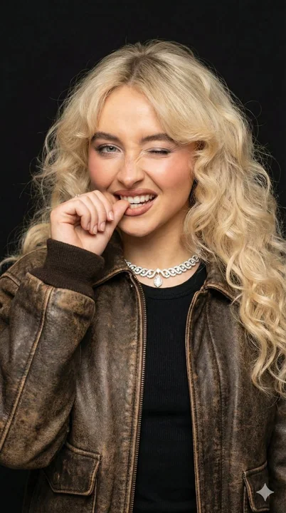 { "prompt_structure": { "subject": { "demographics": "Young woman, early 20s, Caucasian", "hair": "Voluminous, shoulder-length blonde hair with tight, defined natural curls/ringlets; messy yet styled texture", "face": "Fair complexion, visible freckles or natural skin texture, one blue eye open, distinct facial structure", "makeup": "Minimal natural makeup, nude lip, subtle mascara" }, "pose_and_expression": { "action": "Biting the thumb of the left hand playfully, head tilted slightly to the right", "facial_expression": "Winking left eye, cheeky/flirtatious grin, scrunching nose slightly", "gaze": "Direct eye contact with the camera (with the open eye)" }, "attire": { "outerwear": "Vintage distressed brown leather jacket, bomber or biker style, worn texture, silver snap button detail on collar", "inner_wear": "Black ribbed crew-neck top", "styling": "Casual, edgy, cool-girl aesthetic" }, "environment": { "background": "Solid, seamless matte black background", "context": "Studio portrait setting, minimalistic to focus on subject" }, "lighting": { "type": "Soft frontal studio lighting (beauty dish or ring light)", "qualities": "Even illumination on the face, creating a catchlight in the eye, soft shadows defining the hair texture, high contrast against the dark background" }, "technical_details": { "camera_settings": "85mm portrait lens, aperture f/1.8 for shallow depth of field, sharp focus on the face", "perspective": "Eye-level, close-up portrait framing (shoulders and head)" }, "photorealism_and_quality": { "style": "Hyper-realistic portrait photography, high fidelity", "resolution": "8k, UHD", "details": "Detailed skin pores, realistic hair strand rendering, leather texture mapping, cinematic lighting" }, "mood": "Playful, confident, flirtatious, energetic, charismatic, candid" } }