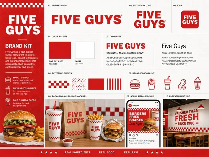 Создайте премиум-бренд-кит-борд для [BRAND NAME], представленный как слайд профессионального брендинг-студии. Показать существующую бренд-идентичность в чистом и организованном визуальном представлении. Включить основной логотип, вспомогательный логотип, иконку, [COLOR PALETTE], пару шрифтов, бренд-упаковку или макеты продуктов, макеты социальных сетей и простые элементы бренд-узора. Стиль: [STYLE]. Использовать чистую редакционную сетку, реалистичные материалы, сильную иерархию и отполированное представление. Текст для включения: "[BRAND NAME]"