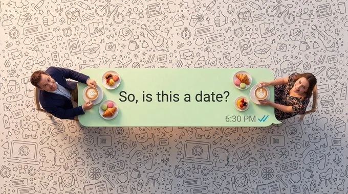 超写实俯视微距摄影。一个细长的浅绿色 WhatsApp 对话框充当餐桌。两个真人(缩小到极小比例)坐在桌子的两端。他们并非塑料人偶;他们拥有清晰可见的皮肤纹理、自然的头发和逼真的衣褶。他们正在享用看起来新鲜烹制的真正食物,而不是橡皮泥。对话框内的文字显示为:“插入文字”。右下角显示时间戳“下午 3:33”和蓝色勾号。背景完全被高密度、无缝的 WhatsApp 涂鸦图案(线条艺术图标)覆盖,没有一丝空白,如同原版 WhatsApp 的密集壁纸。专业影棚灯光,8K 分辨率,清晰对焦。