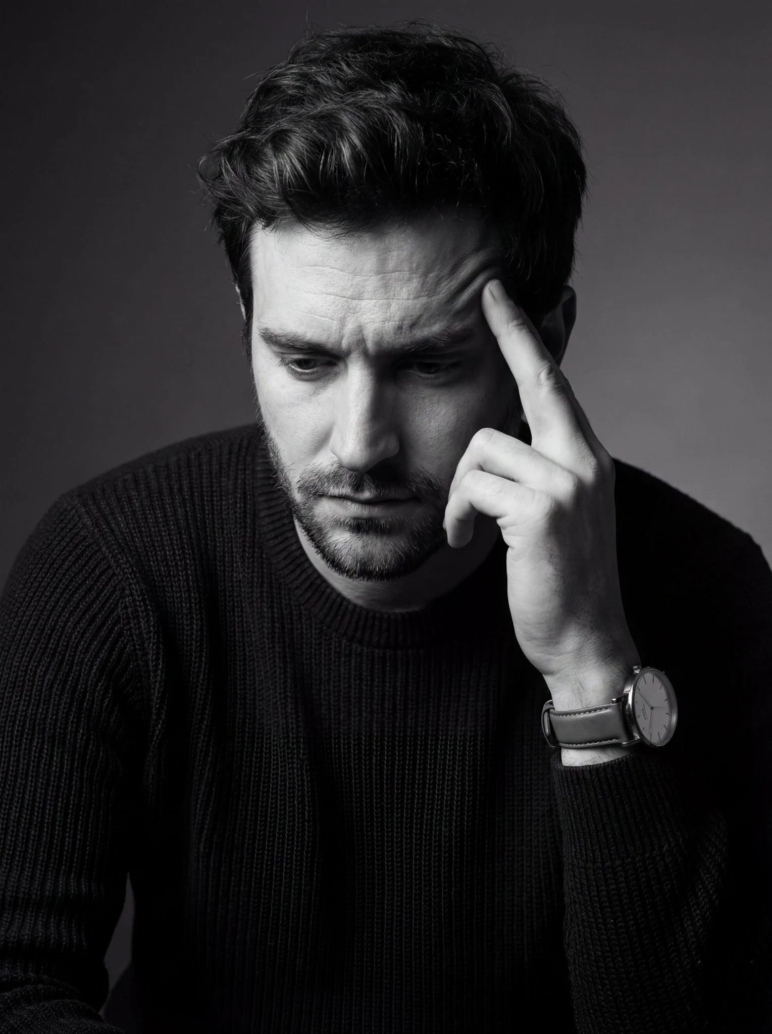 "pose": "head tilted downward, hand raised to temple in contemplative gesture",