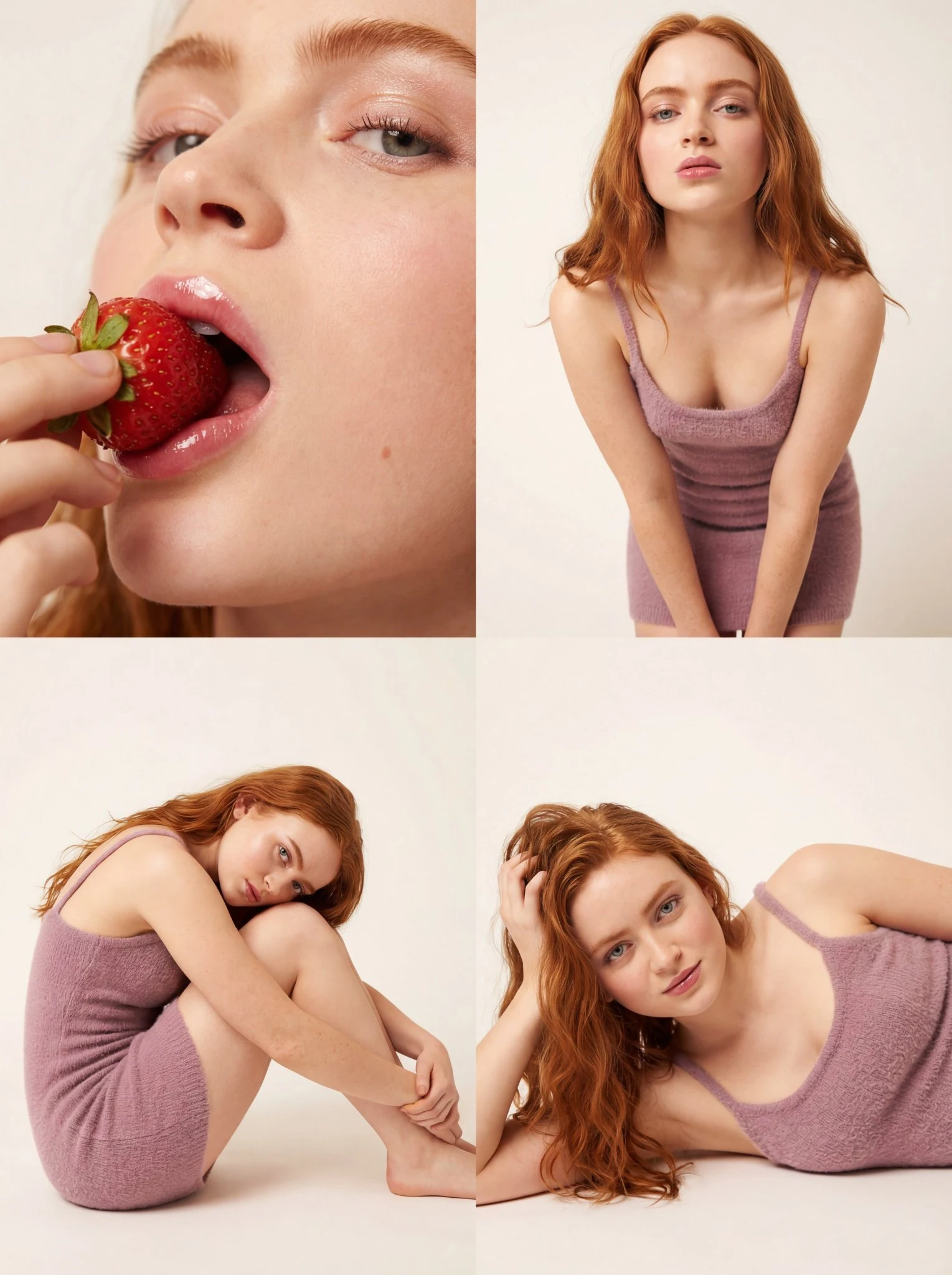 "action": { "primary": "Eating a strawberry", "nuance": "Delicate finger hold, lips slightly parted" },