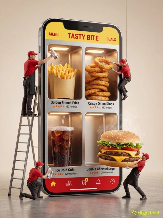 * Four miniature workers dressed in [UNIFORM DESCRIPTION: e.g., black jumpsuits, red aprons, neon vests]. They are photorealistic humans, NOT dolls or plastic figures.