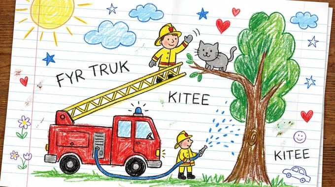 Dessinez [VISUEL] comme s'il avait été créé par un enfant de 6 ans joyeux sur une feuille de papier blanc d'un cahier. Utilisez des traits épais au crayon à cire, des contours tremblotants et des formes simples en couleur plate. Les couleurs doivent être vives, audacieuses et légèrement sorties des lignes, avec des marques visibles de pression et de petites taches. La perspective est innocente : les objets peuvent flotter, et la taille dépend de l'importance, pas de la réalité. Les visages sont des points avec des sourires courbes ; les mains sont des formes en blocs ronds comme des gants ; les animaux sont arrondis et amicaux. Ajoutez des éléments ludiques tels qu'un soleil dans un coin, des nuages moelleux, des étoiles et des cœurs. Incluez une ombre dessinée de manière irrégulière, quelques petits croquis dans les marges et un ou deux étiquettes manuscrites avec une orthographe enfantine.