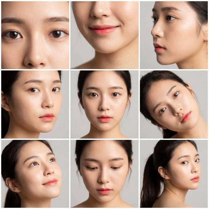 Коллаж с девятью ячейками, в котором изображена та же красивая женщина восточной азиатской внешности с японским стилем макияжа, представленная в девяти разных кадрах и ракурсах: (1) экстремальный крупный план глаз, (2) крупный план губ и нижней части лица, (3) боковой профиль в крупном плане, (4) трехчетвертный вид лица в крупном плане, (5) прямой портрет в крупном плане, (6) крупный план с наклоненной головой, (7) крупный план взгляда вверх, (8) крупный план взгляда вниз, (9) крупный план с видом через плечо. Каждый кадр показывает: женщину, молодую, восточноазиатскую, с большими выразительными глазами, густыми естественными ресницами, черные волосы, повседневный, современный, комфортный образ, хвостик с челкой, светлая кожа, бледный цвет лица, видимые поры, естественные недостатки, овальное лицо, тонкое и изысканное азиатское лицо, симметричные черты, стиль макияжа K-beauty корейского происхождения, свежая естественная кожа с эффектом влажности, градиентные губы, прямые брови, невинный взгляд, расслабленное, уютное, тёплое и приглашающее настроение, сочетание тканей и дерева, естественное уютное сочетание, мягкие ткани с тёплым деревом, естественный свет из окна, мягкий свет из окна, рассеянный дневной свет, скандинавский стиль, мягкий утренний солнечный свет, проникающий через окна, свежая и энергичная атмосфера, нежные тени, контурный свет, свет на краю, синеватый оттенок, свет для красоты, мягкий свет, под углом 45 градусов, фон студийного фона, лёгкий серый цвет, чистый фон.