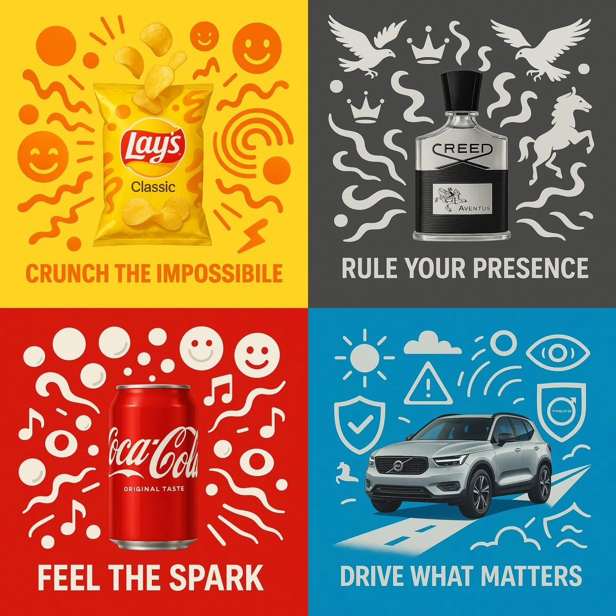 “[Product Name]” placed at the center in full photorealism, surrounded by surreal vector illustrations using exactly two bold, vibrant colors that match the product’s mood. The scene is minimalistic yet energetic, with abstract vector shapes (symbols, lines, expressions, etc.) orbiting or interacting with the product. Add the real logo clearly and integrate a short 3–4 word slogan at the bottom. Style: surreal, high-resolution, minimal, cinematic lighting, 1:1 aspect ratio.
