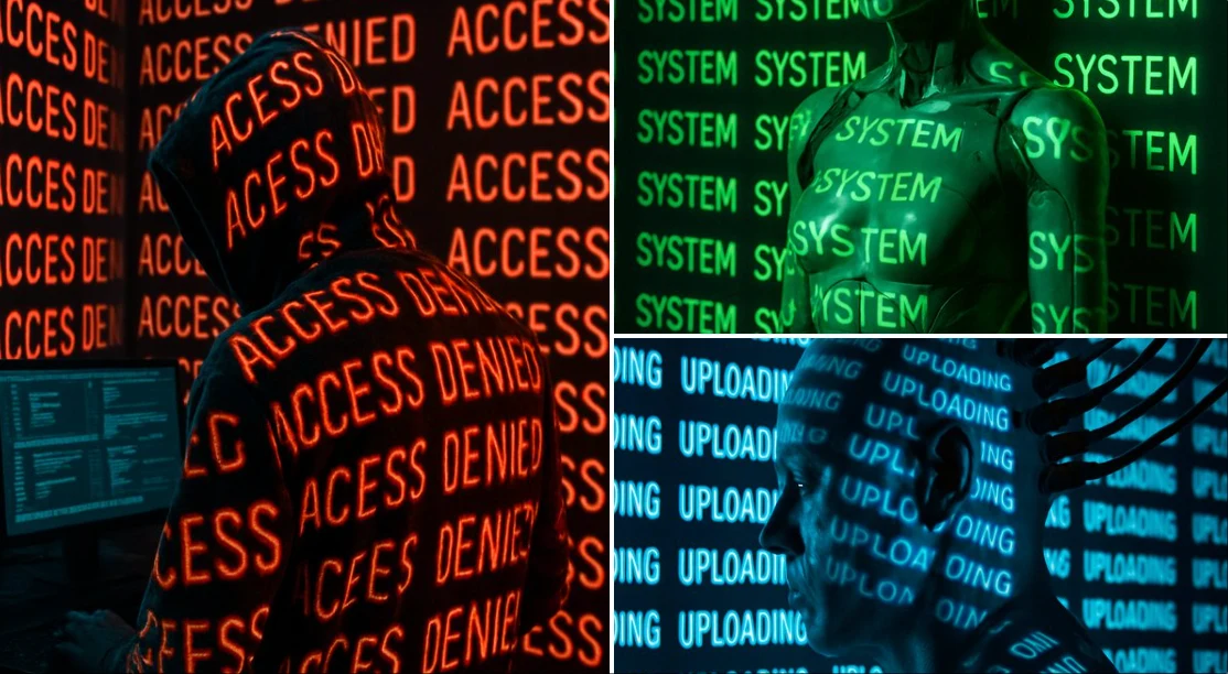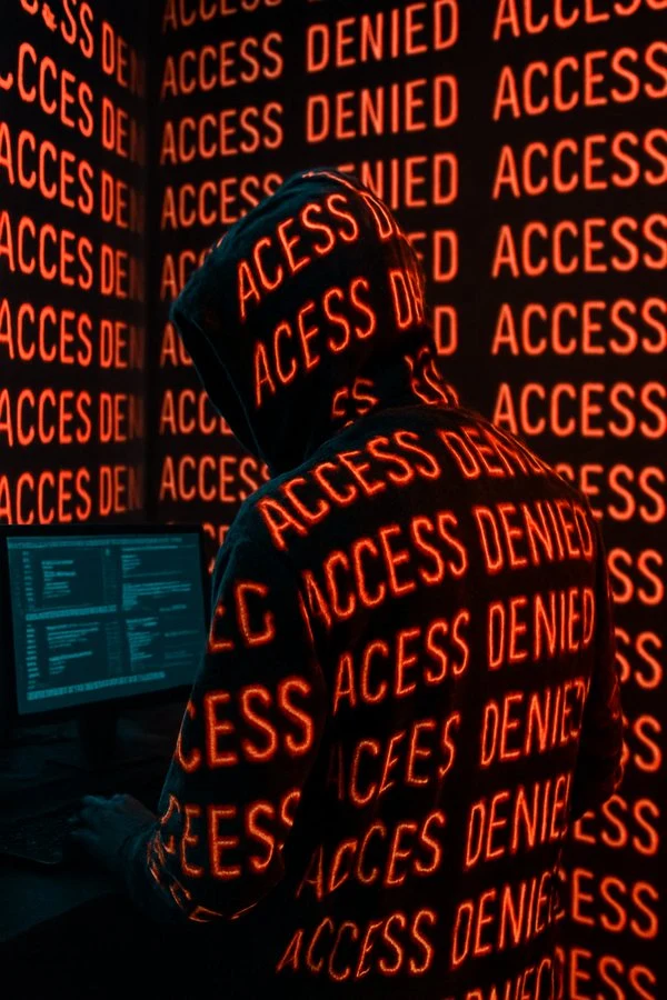 A [PERSON] in a dark room with a glowing projection of the word "[WORD]" repeated endlessly across the walls and body. The text is projected in high-contrast, neon [COLOR], wrapping around the contours of the object, creating a surreal, futuristic lighting effect. The background and object are seamlessly blended into the immersive text environment. Photorealistic, sharp shadows and light distortion where the text bends over curves. Studio lighting with deep contrast, moody cyberpunk aesthetic.