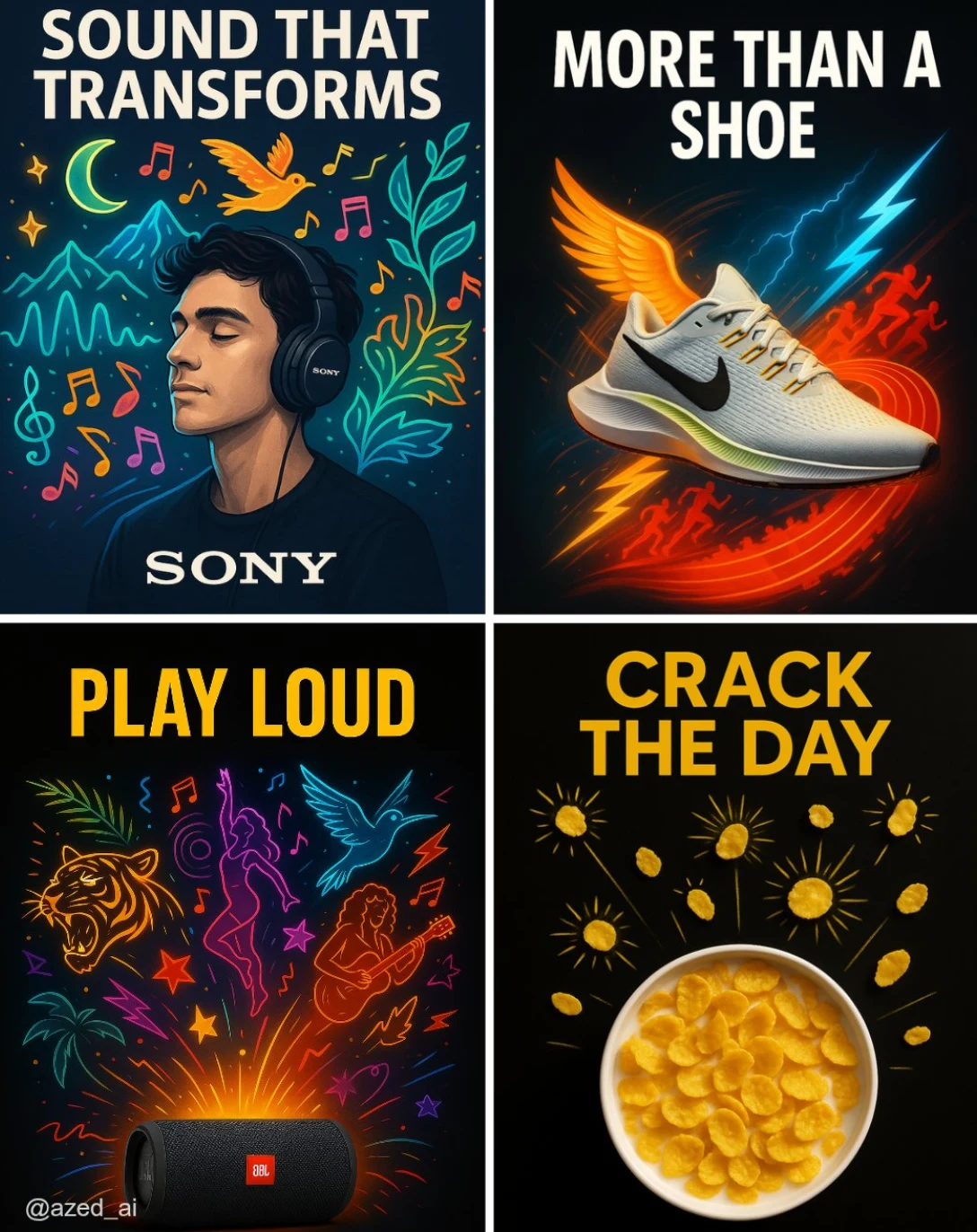 A high-impact advertisement set against a clean, dark or high-contrast background. A [product] is centered, sharply lit and highly detailed. Around it, surreal, stylized visual [elements] illustrations explode outward (e.g., musicians, runners, curls, sunbursts), vibrant color palette, neon. bold uppercase ad copy at the top that reads [TEXT] and the brand logo at the bottom, modern Ad
