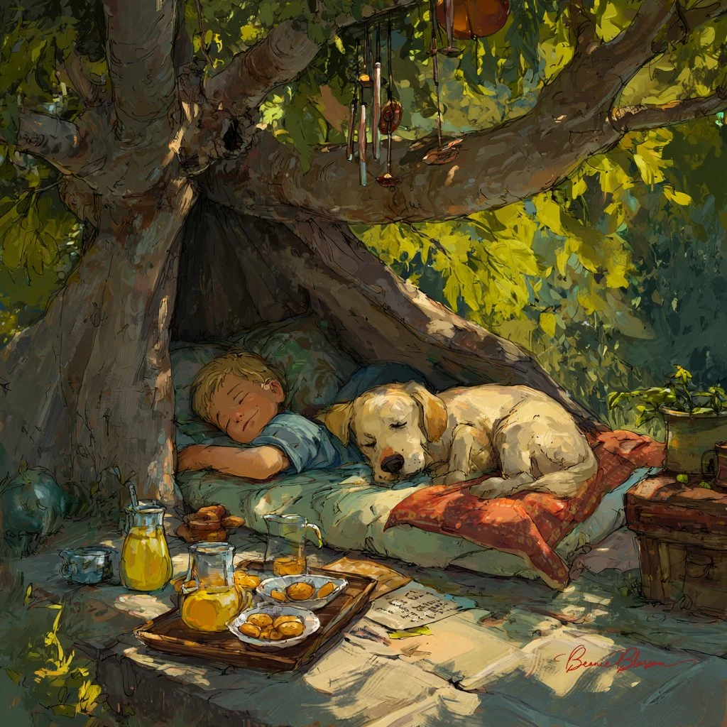 A pillow fort in the backyard, shaded by a big old tree. Sunlight filters through the leaves, and a young boy and his golden retriever nap beside a tray of lemonade and cookies. Wind chimes tinkle gently in the breeze. Warm afternoon light, playful and nostalgic, children's book illustrated feeling