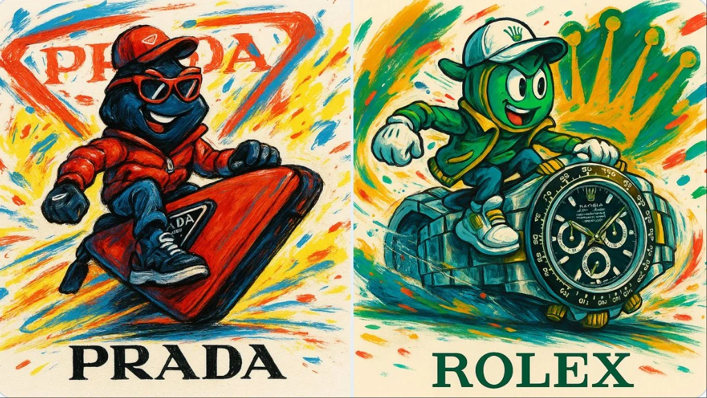 A fictional character shaped like a [Brand Name] product, wearing clothing that reflects the brand's identity, sitting or riding on an oversized version of one of the brand's products as if it were a futuristic vehicle. The design features an expressive, dynamic artistic style full of motion and vibrant colors, with a large abstract version of the brand’s logo in the background. Freely drawn elements and colors representing the brand are scattered throughout. The background is light-colored, and the brand’s logo appears at the bottom. aspect 1:1