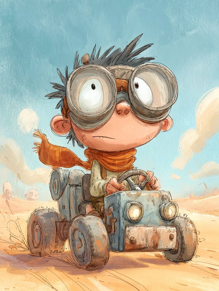 a young cartoon boy with big goggles and scarf driving a tiny makeshift vehicle in the desert, cute post-apocalyptic vibe, indie animation style, soft colors, emotional and adventurous --ar 3:4 --raw --p
