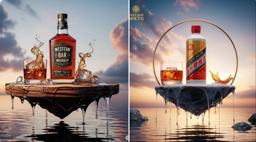 A highly detailed cinematic advertisement scene featuring [TYPE OF ALCOHOL, BRAND], standing on a surreal floating platform that visually embodies its spirit. The platform is made of materials that represent the drink’s essence (e.g. sparkling crystals for champagne, rich dark wood for whiskey, frosted ice for vodka), with dramatic reflections and melting details dripping into a calm reflective water surface. A matching glass is filled with the drink, featuring artistic textures (ice, gems, swirling liquid). Soft, colorful sunset sky with dramatic clouds in the background, high-end luxury aesthetic, photorealistic, macro details, dreamy glow, premium product photography.