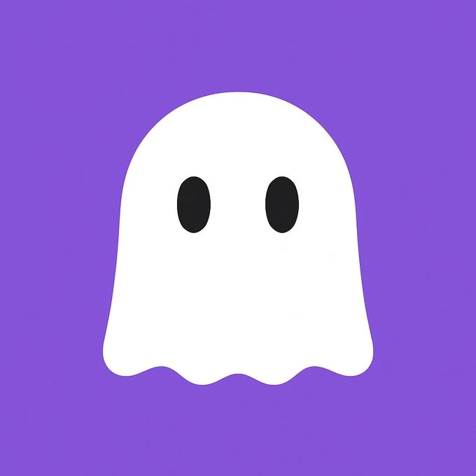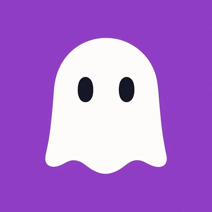 A cute cartoon ghost is the absolute main subject of the picture. It has a pure white body with a smooth and rounded contour, and two simple black oval eyes, with no extra features. This ghost is floating quietly in the very center of the picture. The background is a pure, bright purple, creating a simple, modern, and friendly atmosphere. The composition is a centered close-up, and the aspect ratio is 1:1 square. There is no text in the entire image. The image style is typical flat design and vector art, minimalist, much like an app icon or a logo, characterized by clean lines and solid color blocks, without any gradients or textural details. The image quality required is high-resolution with clean, sharp edges. The overall feeling it gives is one of a cute, simple, and modern piece of digital art.