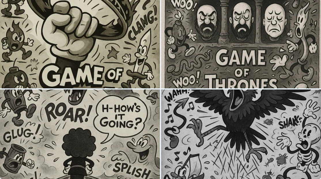 Transform this image into a 1930s animation storyboard in the style of Fleischer Studios. Use greyscale with expressive inky shading and rubber-hose limbs. Surround the scene with anthropomorphic objects, bouncy motion lines, and slapstick action. The overall tone should be jazzy, lively, and playful. Add hand-lettered sound effects and quirky dialogue signs.