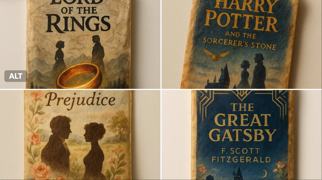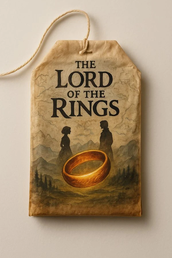 A single vintage tea bag lying on a clean white background, hand-painted with an intricate illustration resembling a book cover. The tea bag has delicate aged paper texture, soft warm lighting, and realistic details. On the painted design, leave a clear blank space labeled [BOOK] for the book title. Cinematic, high-resolution, vertical format 9:16.