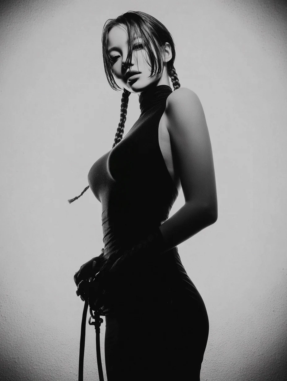 A woman standing confidently in a minimalist studio, shot from a slightly low angle, half-body portrait, her head tilted slightly down with a calm and enigmatic expression, middle-parted braided pigtails with a few loose strands falling over her face, subtle wet hair texture, wearing a tight black sleeveless dress and black leather gloves, holding a leather belt loosely in front of her body — dramatic single key light from upper right, high contrast, black and white tones, strong rim light accentuating her curves, plain textured wall background, cinematic noir atmosphere, fine art fashion photography, inspired by Helmut Newton and Peter Coulson, shallow depth of field, smooth gradients, elegant and powerful mood