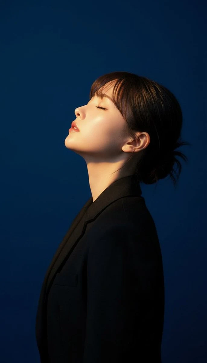 تقف أمام خلفية زرقاء داكنة وترتدي معطفًا أسود من قماش الزيتون. ينير ضوء مركّز لونه دافئ من الزاوية العلوية اليمنى، مما يخلق تأثيرًا برتقالي على وجهها ورقبتها، ويُشكّل تباينًا حادًا بين ظلال الأزرق البارد والضوء الدافئ.