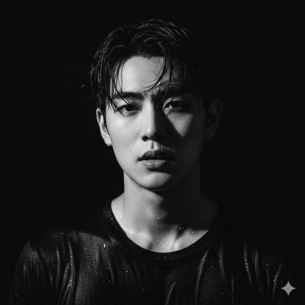 A high-drama black and white close-up portrait showcasing a handsome young East Asian male. His hair is slightly damp, messy against his forehead and cheeks, with a few droplets of water on his face. His eyes are glazed, lips slightly parted, expressing a touch of vulnerability and allure. He wears a black T-shirt soaked in water, clinging to his shoulders. Strong side lighting highlights the droplets on his face and the moist skin, creating sharp highlights that contrast dramatically with deep shadows. A minimalist dark background gives the photo a strong cinematic atmosphere, high detail, heavy film grain texture, conveying a mysterious and tense emotion.