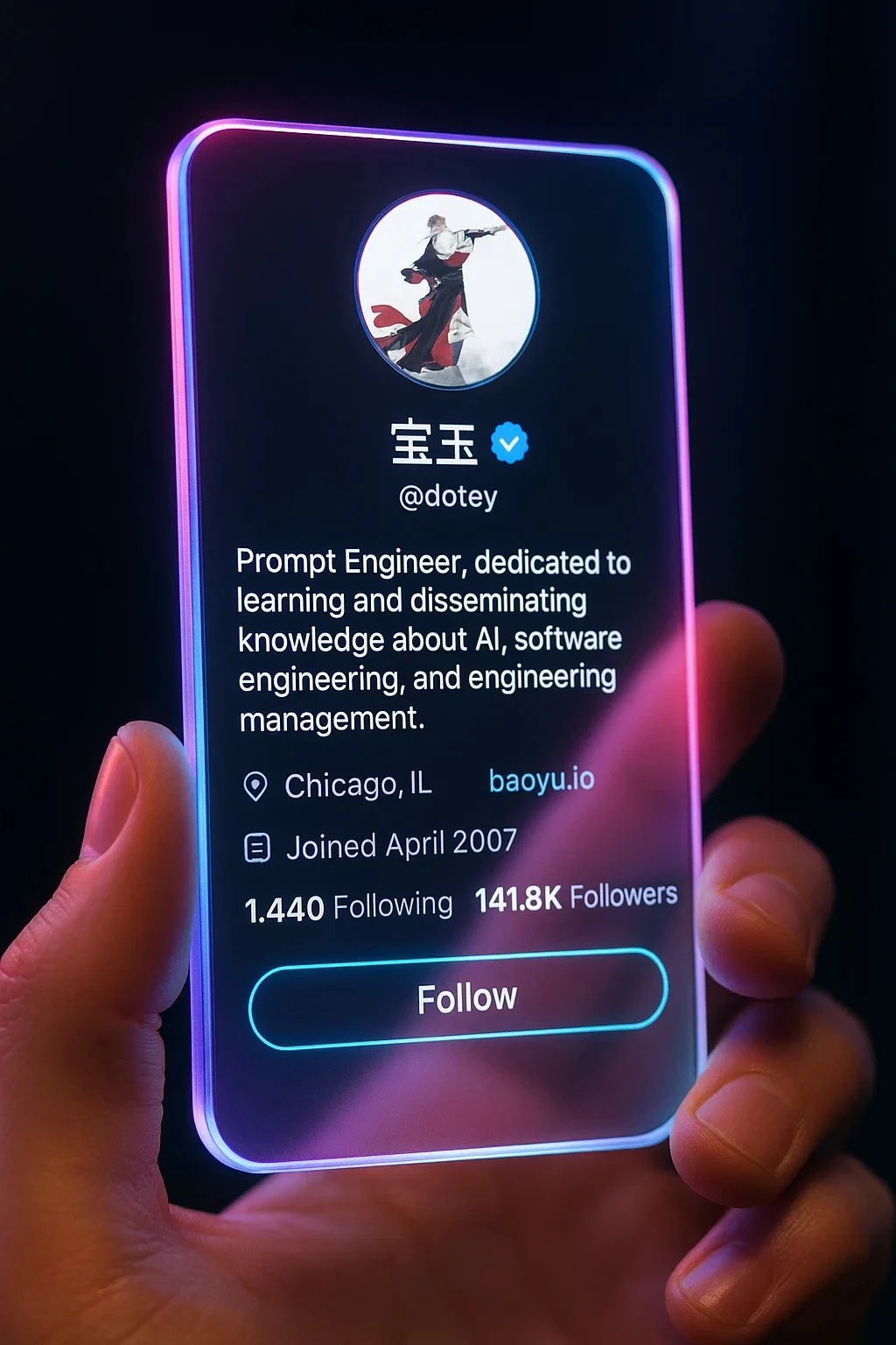 A 9:16 vertical, realistic cyber aesthetic future social media app interface photo: one hand holding a vertically oriented semi-transparent acrylic card that occupies most of the frame. It displays a social media profile interface, but without any banners or background images. The card has smooth rounded edges and glows with soft neon lights, showing a gradient of pink, purple, and blue. The background is dark and blurred to highlight the glowing edges. The surface of the card is crystal clear, with the profile details appearing as if engraved, only displaying information from the reference image in order: