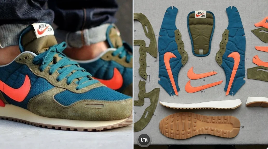 Create an image of the different patterns that make up this shoe. Lay them out individually against a neutral surface.