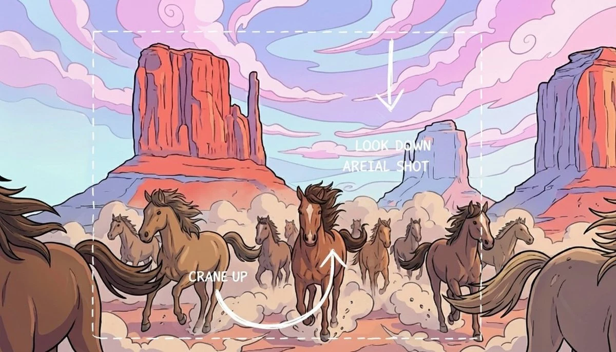 add sketch annotations on top of this image explaining the camera movement. I want it to crane up and then look down as an aerial shot