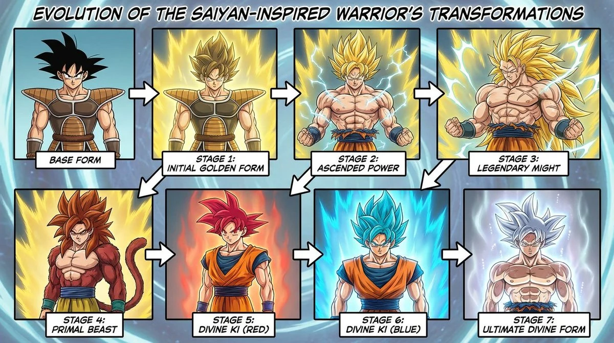 Créez un tableau visuel détaillé montrant l'évolution complète des "transformations du style Super Saiyan", en utilisant un guerrier original inspiré des Saiyans, représenté à plusieurs étapes allant de la forme de base aux transformations divines.