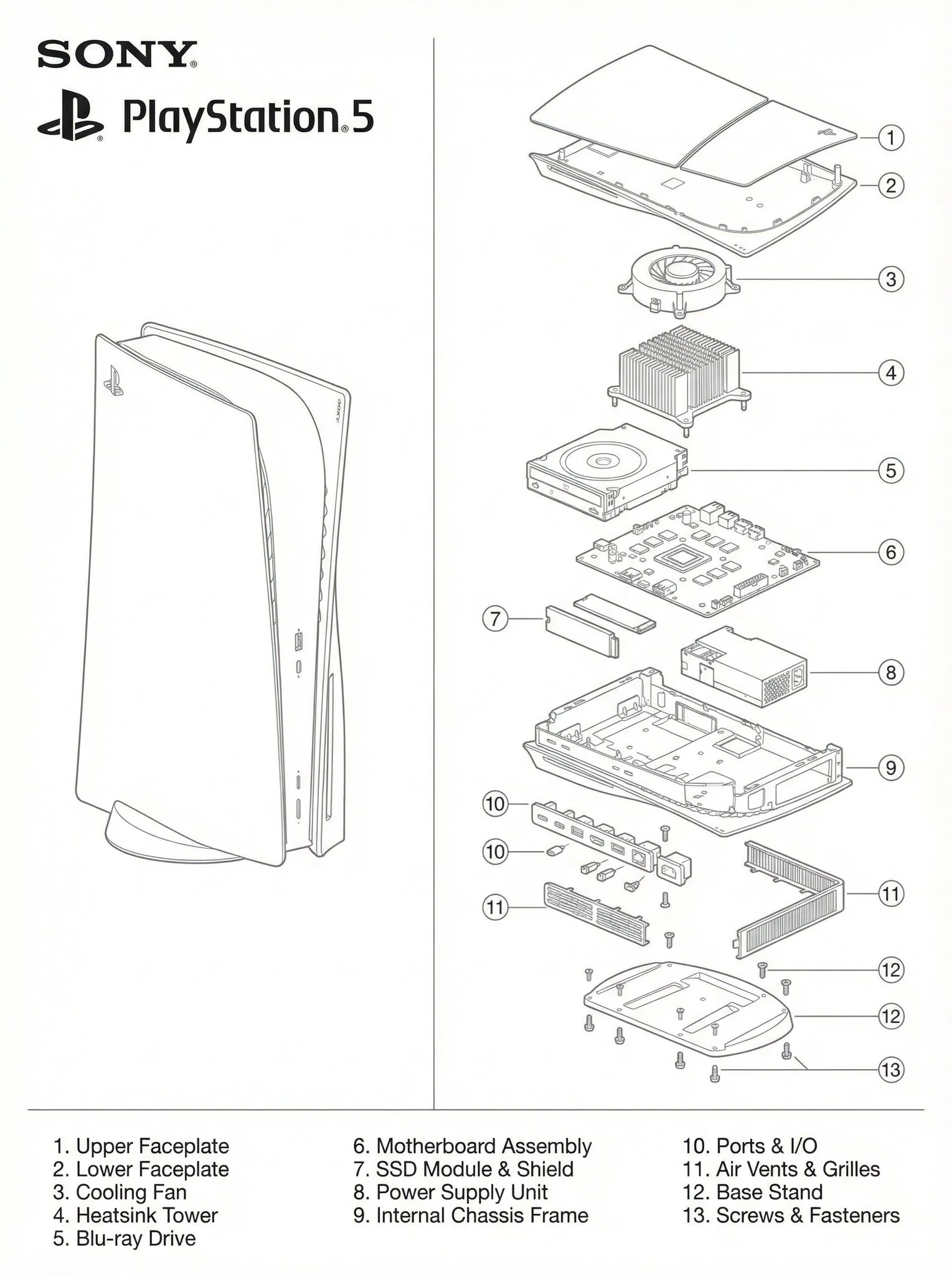 A two-panel technical blueprint diagram in clean monochrome line-art, matching the exact layout of the provided PlayStation 1 schematic. On the left side, draw a full, intact Sony PlayStation 5 console in precise thin line-art on a white background. On the right side, draw a highly detailed, vertically exploded-view diagram of the PS5 showing each internal component separated into layers: outer shell panels, faceplates, cooling fan, heatsink tower, Blu-ray drive, motherboard, SSD module, power supply, internal frame, ports, vents, base stand, screws. Use consistent thin grey line-weight with no shading. Add numbered circular labels around each part, and include a matching numbered parts list at the bottom just like the reference blueprint. Place the SONY logo, PlayStation logo, and "PlayStation 5" text in the top left in the exact same position and style as the uploaded reference image. The entire artwork should mirror the composition, spacing, typography, and minimalist engineering-ma