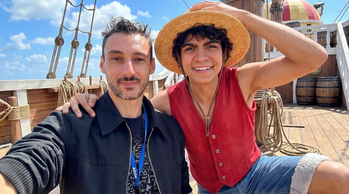 Place Monkey D. Luffy next to the man, smiling widely with his straw hat tilted. Use a Thousand Sunny deck background with bright blue sky. Keep the selfie composition intact and integrate both characters naturally.