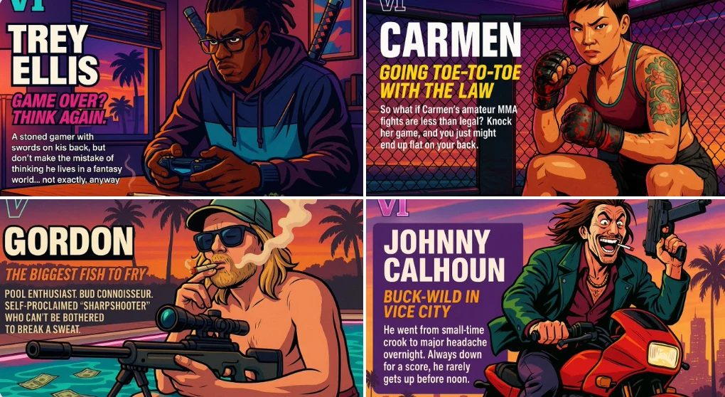 *Vibrant Vice City aesthetic: Sunset lighting, neon accents, cel-shaded comic style.*