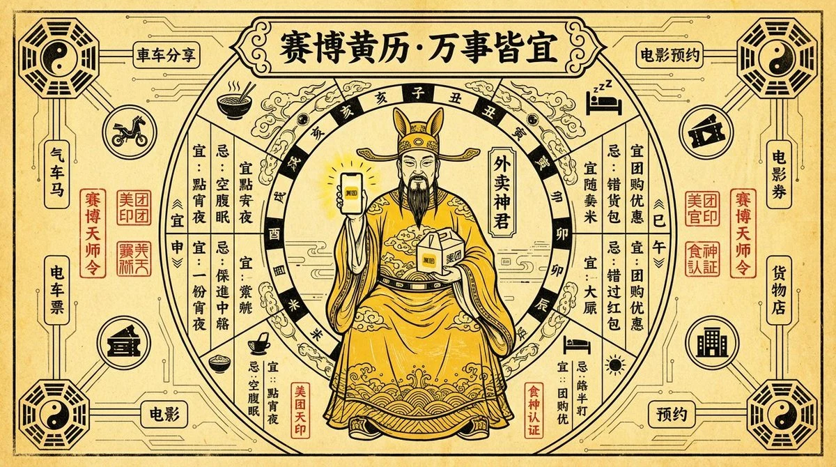 Aspect ratio 16:9, a super complex commercial poster designed for Meituan, with a style of futuristic Taoist calendar or talismanic diagram.