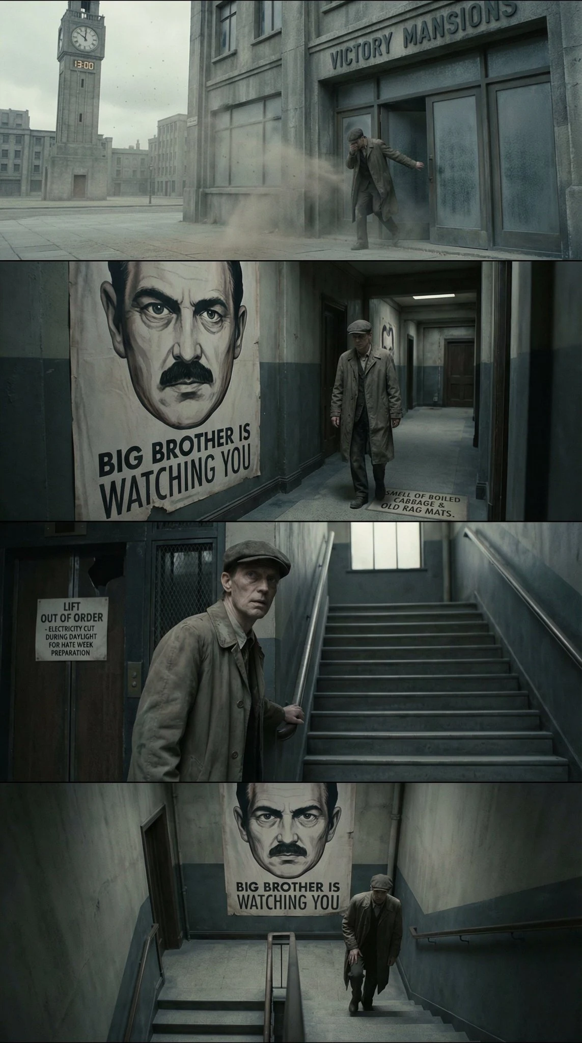 Create a cinematic storyboard of the first page of 1984, by using widescreen panels.