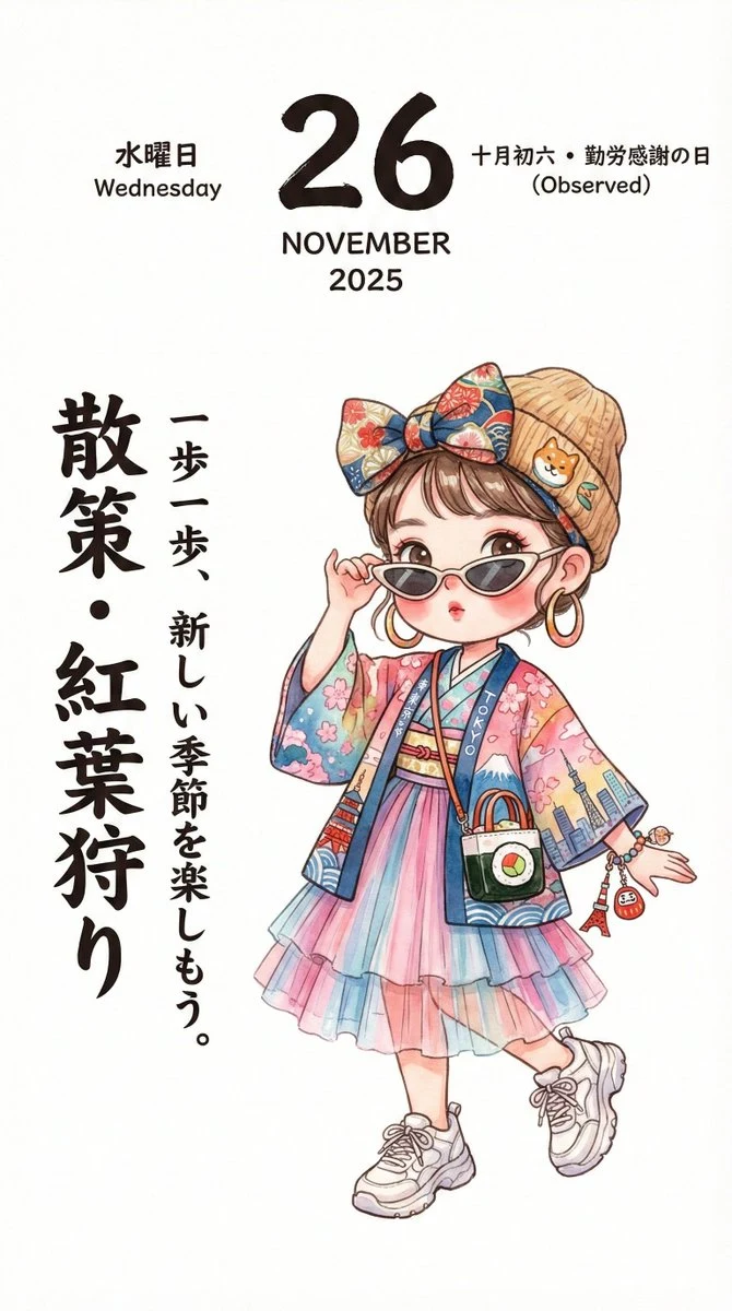 - Outfit and accessories must reflect seasonal elements, holidays, recommended activities ("auspicious items"), or distinctive local characteristics based on the user's location and input. Outfit description: [{Character Outfit Description}]