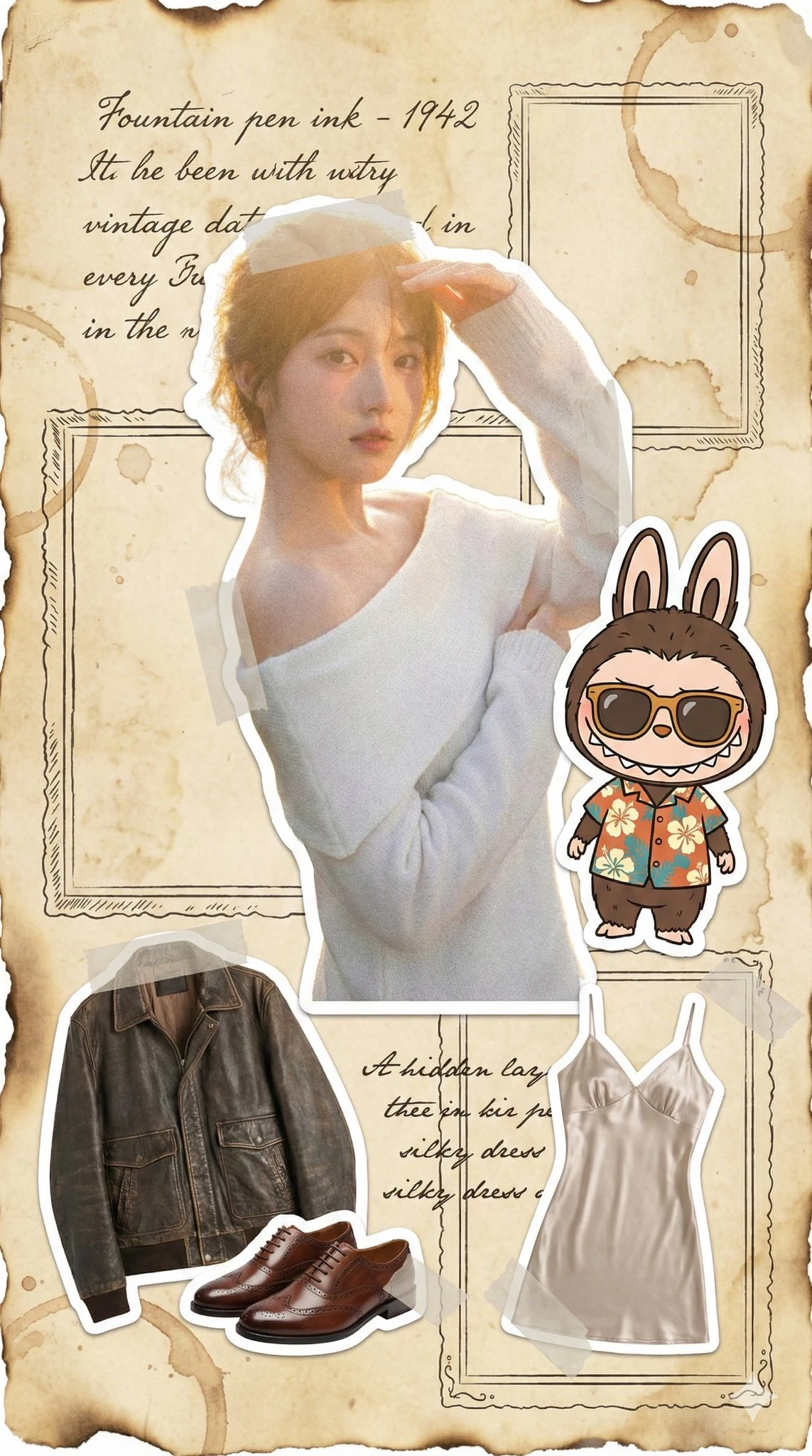 A 9:16 fashion illustration with a retro nostalgic style. The background mimics aged yellowed letter paper, featuring hand-drawn textures with scorched edges and coffee stain imprints. In the center is a sticker of the user's vintage outfit, processed to have film grain but retaining the white sticker border. A Labubu doll sticker wearing vintage sunglasses and a floral shirt sits beside it. The clothing deconstruction section showcases stickers of a vintage leather jacket and Oxford shoes. A hidden layer sticker features a vintage silk bikini dress with smooth texture. Around it, elegant cursive English dates and retro frame graffiti are drawn in pen ink style. The edges of the stickers are secured with semi-transparent tape patterns. The image is flat, without any writing tools or hands appearing in the scene, purely a retro flat design.