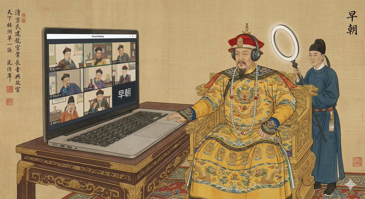Traditional Qing dynasty court painting style. The scene depicts the emperor sitting solemnly on the dragon throne in the Hall of Supreme Harmony. However, instead of kneeling ministers before him, he is facing a large laptop screen placed on the imperial table. The screen shows a grid view from a "Tencent Meeting," with ministers attending from their respective mansions; some look bored, and one is secretly eating noodles. The emperor is wearing over his court cap a pair of headphones. A eunuch stands behind holding a ring light to ensure the emperor looks healthy on camera. The text on the screen reads "Morning Court."