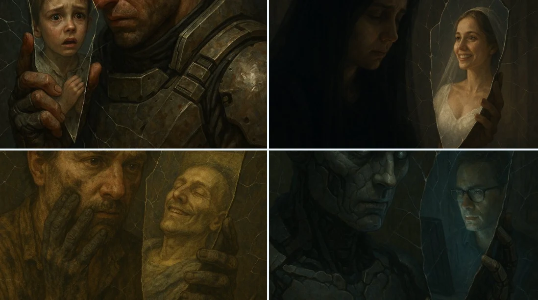 A close-up of [SUBJECT 1] holding a mirror shard to their face. The shard reflects a completely different [SUBJECT 2]. Around them, small cracks spread through the air like fractures in invisible glass, warping the space itself.