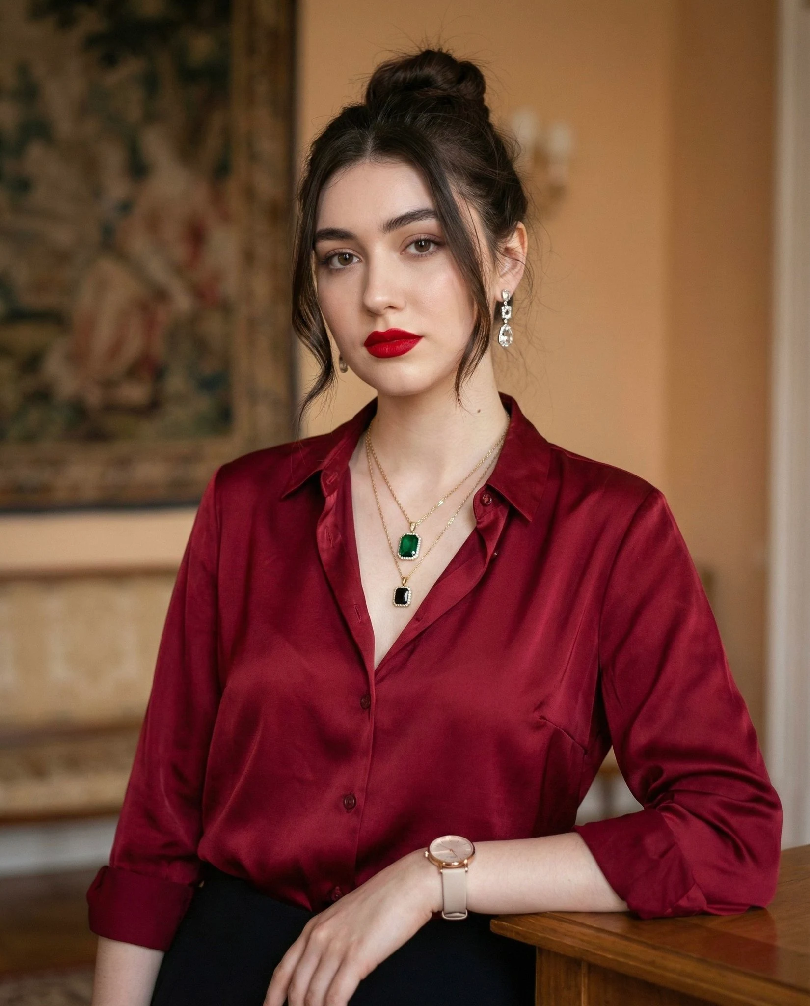 “expression”:“calm, confident, slightly serious with bold red lips”,