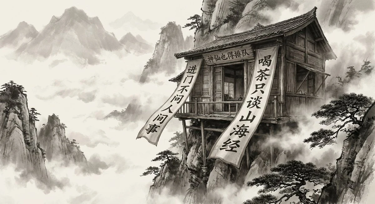 The combination of ink wash painting style and realistic photography. On the edge of a deep mountain cliff shrouded in mist, there is an ancient wooden teahouse that seems on the verge of collapse. A huge couplet hangs at the entrance of the teahouse, fluttering in the wind. The upper scroll reads: "Inside, one does not inquire about worldly affairs," and the lower scroll reads: "While drinking tea, only the tales of mountains and seas are discussed." Above it is a weathered plaque with the inscription: "Even immortals must queue."