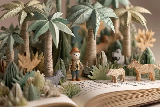A 3D pop-up book illustration featuring a [subject], with layered paper elements unfolding into a miniature scene. Soft lighting, textured paper surfaces, playful handcrafted look, pastel [color1] and [color2] palette, viewed from a slight angle to show depth and detail.