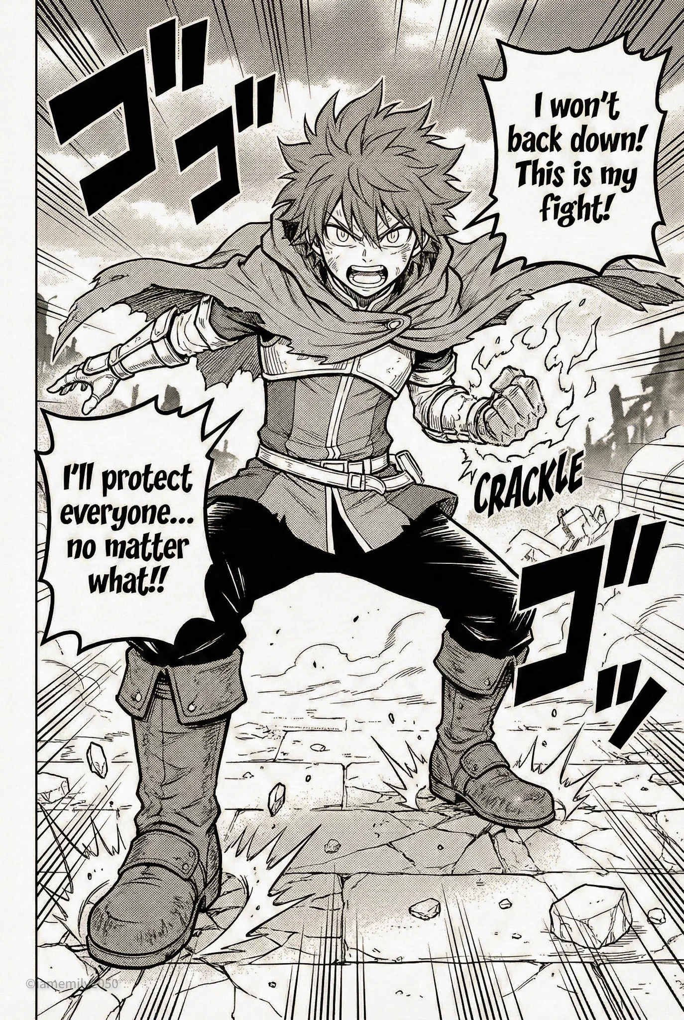 "intent": "A dramatic, high-energy battle scene featuring a determined young mage making a defiant declaration, in the style of modern Shonen fantasy manga.",