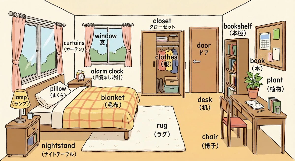 Please draw an illustration of a bedroom. Label all items in English/Japanese. Please write in the following format: English (Japanese).