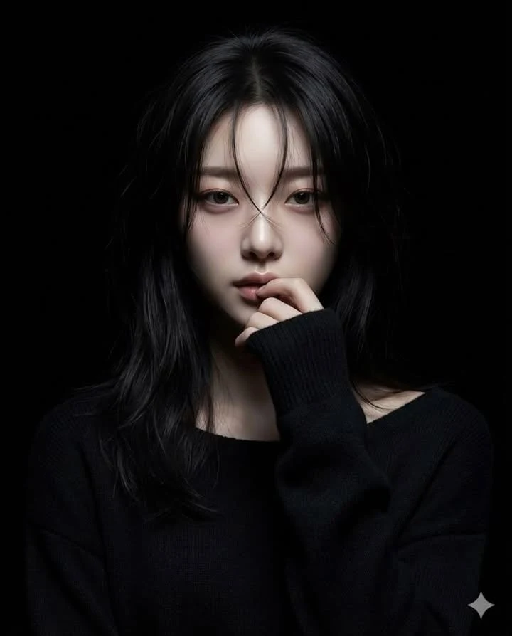 Освещение: используйте **узкий луч прожектора**, сфокусированный только на центре лица. Края света должны быть острыми и драматичными. Все области вне прожектора должны быстро погружаться в глубокую тьму (резкое затенение), почти сливающуюся с чёрным фоном. Не используйте мягкий свет.